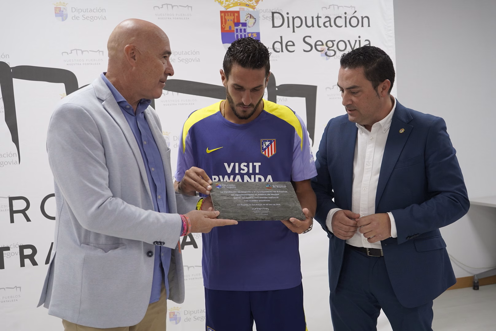 En medio de la tradicional concentración del Atlético de Madrid en Los Ángeles de San Rafael, el capitán del primer equipo, Jorge Resurrección ‘Koke’, ha recibido esta mañana al diputado de Deportes, Óscar Moral, y al diputado de Turismo y alcalde de El Espinar, Javier Figueredo, junto a quienes ha ejemplificado el histórico hermanamiento entre el club, el municipio y la provincia. Durante el encuentro, en el que también ha estado presente parte de la corporación espinariega, Moral y Figueredo, en representación de Diputación y Ayuntamiento, han hecho entrega al jugador de una placa conmemorativa en agradecimiento por el compromiso y la vinculación histórica del Atlético de Madrid con la provincia. Por su parte, Koke ha devuelto el agradecimiento en forma de camiseta personalizada a ambos, mientras han conversado sobre la costumbre del club de dar comienzo al curso en Segovia y el exigente calendario de competición al que el conjunto colchonero dará comienzo en las próximas semanas.