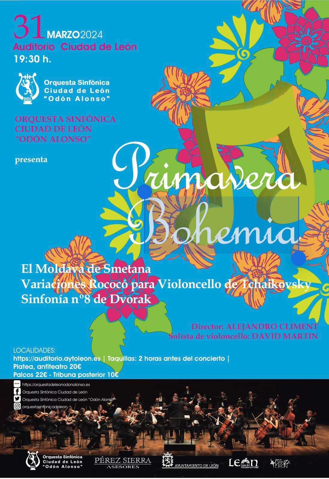 En esta ocasión, sobre el escenario será el turno de una programación conformada por ‘El Moldava de Smetana’, ‘Variaciones Rococó para Violoncello de Tchaikovsky’ y ‘Sinfonía nº8 de Dvorak’, bajo la dirección de Alejandro Climent y con Savid Martín como solista de violoncello.
